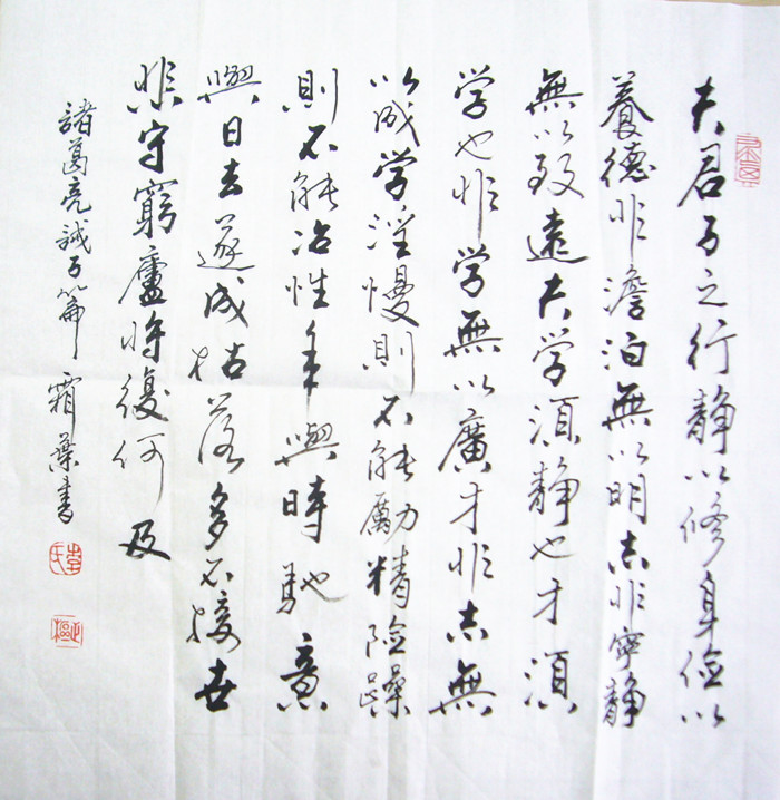 第一字画网的诸葛亮家训《诫子书》,适合挂在家里的客厅或书房,公司的办公室等场合,这幅办公室客厅字画诸葛亮家训《诫子书》书法的作品,作品的水准和字的功力,都是上佳之作,如果放在画廊出售,李正枢老师此幅书法诸葛亮家训《诫子书》行书书法作品的标价大约在1600元左右。李正枢老师,字霜叶,云南的老书法家,兰亭杯书法大赛的特邀参展嘉宾,擅长行楷,几十年的书法功力,功力深厚。李老师四尺对开书法在云南的艺术品拍卖行已经是2000元起拍价了,书法的实力不用多说,光看字的水准就知道了。