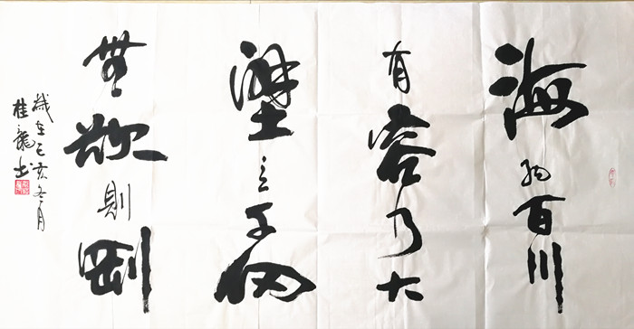 第一字画网的适合办公室挂的字,郁桂龙老师这幅四尺是适合办公室挂的字,气派非凡,笔法老练,内容为:海纳百川、有容乃大,壁立千仞、无欲则刚,装裱后尺寸达到1.8米长,如果放在画廊出售,湖北书法家郁桂龙老师这幅四尺书法的价格在1500元左右。