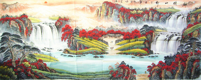 第一字画网的客厅山水挂画山水画聚宝盆,是一副大气磅礴的作品,彩墨交融,墨色清雅,是王咏茗老师的用心作品。小八尺大写意山水裱完后尺寸达到3米左右,如果放在画廊出售,王咏茗此副大写意山水的标价在7000元左右。这幅作品适合挂在家里的客厅、或公司的办公室、会议室等场合,作品布局合理、意境深动。