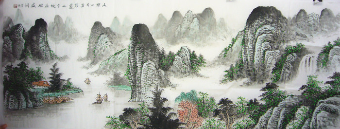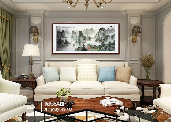 第一字画网的山水画作品山水国画,这幅漓江山水画裱完后尺寸近2.2米左右,是一幅清新雅致的国画客厅山水画作品,清新秀雅,布局合理,这幅山水美景视觉效果上佳。如果放在画廊出售,一门人老师此幅六尺国画客厅字画的标价在3000元左右。