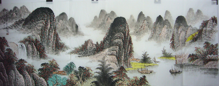 第一字画网的客厅国画作品山水国画,这幅漓江山水画裱完后尺寸近2.2米左右,是一幅清新雅致的国画客厅山水画作品,清新秀雅,布局合理,这幅山水美景视觉效果上佳。如果放在画廊出售,一门人老师此幅六尺国画客厅字画的标价在3000元左右。