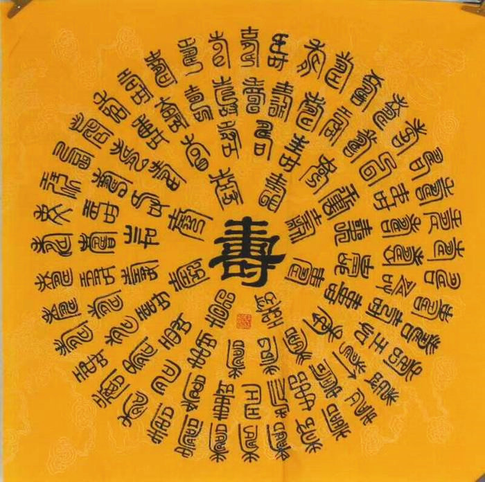 第一字画网的篆书书法百寿图,适合挂在公司的办公室,或是家里的书房,这幅四尺书法是广西书法家秦春斌老师的作品,装裱后长度约在0.8米左右,作品笔法老练苍劲大气,如果放在画廊出售,秦春斌老师此幅家居客厅书法的标价大约在1500元左右。