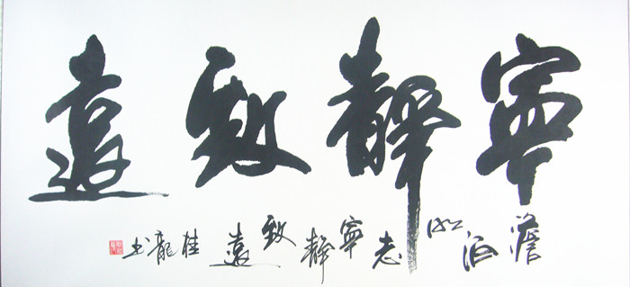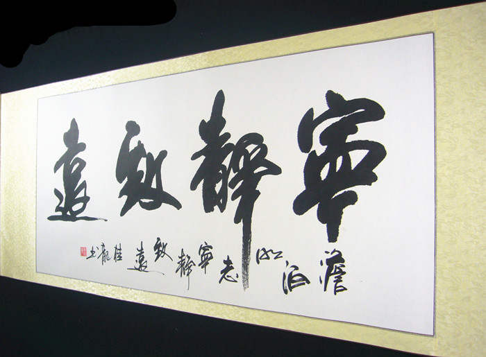第一字画网四字书法《宁静致远》,是四尺的书法作品,桂龙老师这幅宁静致远书法作品非常适合挂在办公室,气派非凡,装裱后尺寸达到1.8米长,如果放在画廊出售,湖北书法家郁桂龙老师宁静致远办公室书法的标价在1500元左右。书法精品作品众多,如精气神书法厚德载福书法等。