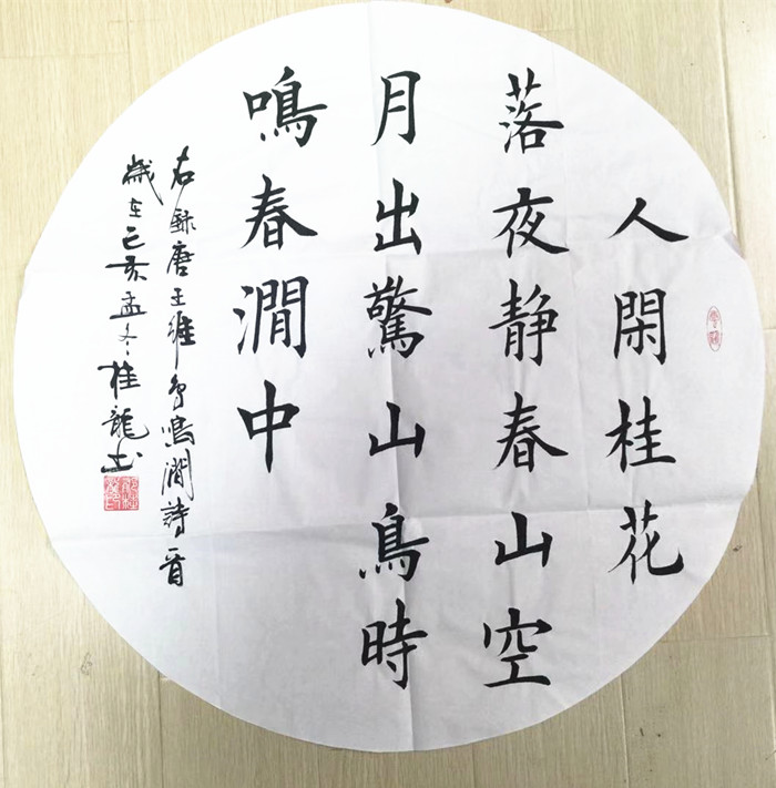 第一字画网的王维诗词客厅书法,是幅适合用作办公室、客厅场合或书房的书法作品,这幅行书书法是湖北书法家郁桂龙老师的作品,画心直径80厘米,如果放在画廊出售,桂龙老师此幅王维诗词客厅书法的标价大约在1500元左右。