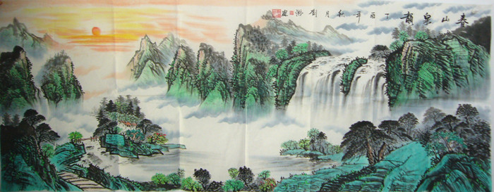 第一字画网的写意客厅山水国画装裱以后在2.2米左右,是一幅大气磅礴的小六尺山水,作品意境生动、山水交汇,清新秀雅,布局合理,视觉效果上佳,看作品的气势、云层和山脉的细节,就能看出老师的深厚画功,画面上的红日寓意着鸿运高照,如果放在画廊出售,刘淋老师此幅山水画的标价在5000元左右,作品的气势和画功都是一流的,适合挂在客厅、或公司的会议室等场合。