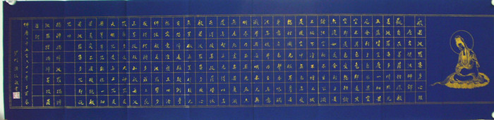 第一字画网的四尺对开书法心经,适合挂在书房或会客厅等不同的场合,这幅四尺对开书法心经装裱后长度约在1.8米左右,作品老练大气,如果放在画廊出售,演信法师此幅行行书书法心经字的标价大约在1500元左右。