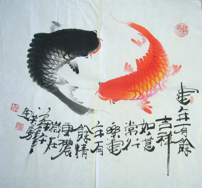 • 产品简介: 招财纳福太极鱼,三尺斗方作品,未装裱。