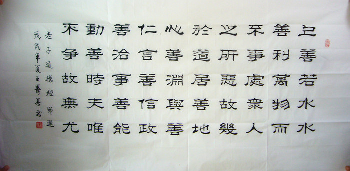 第一字画网的四尺隶书书法上善若水,是用隶书完成的道德经》第八章,这幅四尺上善若水书法装裱后长度达到1.8米左右,作品笔法老练,苍劲有力,如果放在画廊出售,山东书协寿善老师此幅隶书书法上善若水书法的标价在1800元左右。