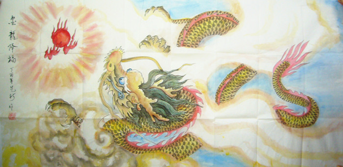 第一字画网的国画龙《金龙降福》,四尺工笔画龙作品裱完后长度达到1.8米,是一副水准出色的国画金龙图作品,作品画风细腻、栩栩如生,挂在客厅或是酒店等场合是非常不错的选择,如果放在画廊出售,汪艺新老师此副四尺工笔龙的图画裱完后的标价在2000元左右。龙是中华民族的象征,我们被誉为是龙的传人,金龙寓意着飞黄腾达,龙腾四海。