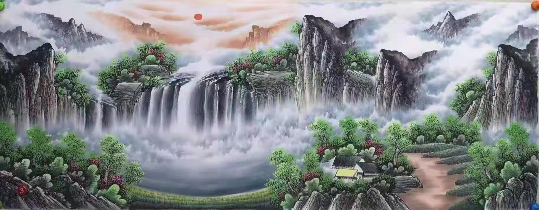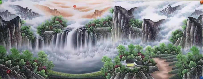 第一字画网的山水画《旭日东升》,小六尺作品裱完后长度2.2米左右,是一幅大气磅礴的山水作品,适合挂在客厅或是公司的会议室等场合,作品意境生动、山水交汇、细节出色,后侧的红日寓意着旭日东升。如果放在画廊出售,王咏茗老师此幅国画旭日东升山水画旭日东升的标价在5000元左右。