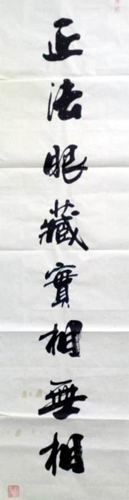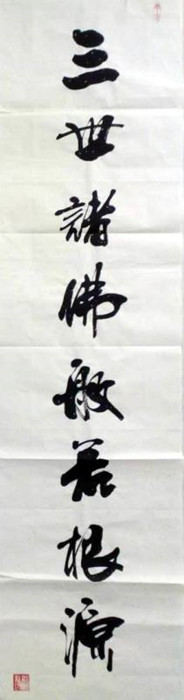 第一字画网的佛字中堂字画配对联 ,,十分雅致,这幅书法是郁桂龙老师老师的行书作品,装裱后长度约在1.8米左右,配上这套内容相得益彰的对联:三世诸佛般若根源、正法眼藏宝相无相;作品笔法老练,如果放在画廊出售,郁桂龙老师此套优秀书法心经中堂对联的标价大约在3000元左右,是寿善老师曾经的隶书参展内容,水准出色。
