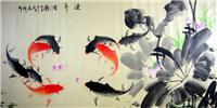 第一字画网的工笔荷花鲤鱼图,这幅四尺工笔荷花九鱼图装裱后尺寸为1.8米左右,是一幅非常温馨的作品,作品画风细腻、栩栩如生,十分雅致。挂在家里客厅或公司的会客室都是非常不错的选择,亦可用作送礼等场合,如果放在画廊出售,诸葛明科老师此幅工笔荷花九鱼图的标价在3000元左右。
