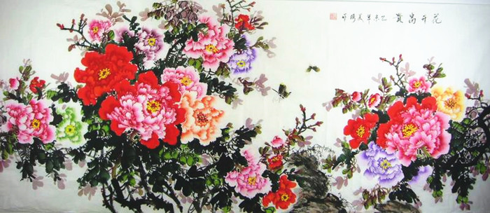 第一字画网的八尺国画富贵牡丹,这幅小八尺的牡丹作品画风温馨、栩栩如生,牡丹寓意着富贵吉祥,作品上又写着花开富贵四个字,挂在家里客厅或是送人都是非常不错的选择,如果放在画廊出售,王美琦老师此幅八尺写意牡丹的标价在2000元左右。