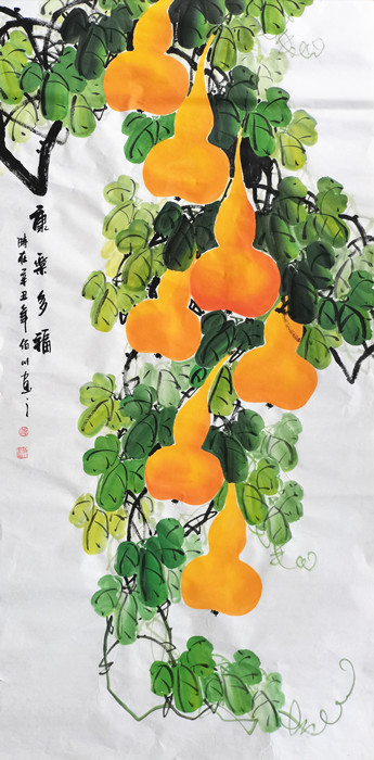 第一字画网的四尺竖幅玄关葫芦画,这幅四尺的葫芦作品裱完后长度近1.8米左右,是一幅水准上佳的作品,作品画风细腻、栩栩如生,葫芦和福禄谐音,挂在家里客厅或是送人都是非常不错的选择,如果放在画廊出售,谭佰川老师此幅国画葫芦的标价在1800元左右。