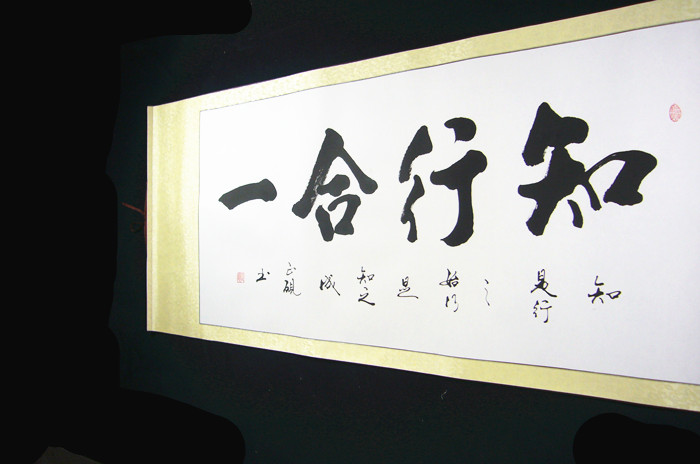 第一字画网的办公室书法知行合一,是幅适合挂办公室或会客室的书法作品,作品是广西书法家甘正砚老师的四尺书法,这幅书法笔法洒脱,气势稳重,已经完成了装裱,装裱后尺寸达到1.8米长,如果放在画廊出售,广西书法家甘正砚老师这幅四字成语知行合一书法的标价在1500元左右。