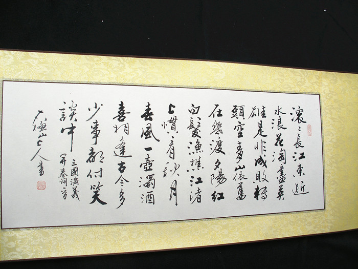 第一字画网的书法三国演义开篇词适合挂书房或其他场合,装裱后尺寸近1.5米长,气派非凡,笔法老练,如果放在画廊出售,李正枢老师此副书房办公室书法裱后的标价在1500元左右。李正枢老师,字霜叶,云南书协的老书法家,擅长行楷,几十年的书法功力,功力深厚。