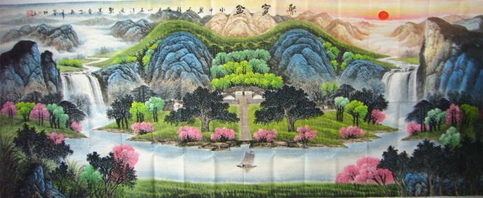 聚宝盆:此画是第一字画网推荐的四季聚宝盆山水画刘淋老师整幅作品根据风水布局、财运如浩浩瀑水,生生不息之意。作品整体看来象个金元宝。远山层峦叠峰,更表达了源远流长的意境。因此挂山水画是非常吉利的。将此风水画悬挂于厅堂,立添主人财气,令人一见即生舒适安逸之感,获人兴财旺之效。青山绿松间配上了瀑布流水,不仅给画面增添了灵韵和动感,更表现了一种财源滚滚,源远流长的吉祥意义。非常适合家居,企业正堂装挂及馈赠亲朋好友的上佳之选~