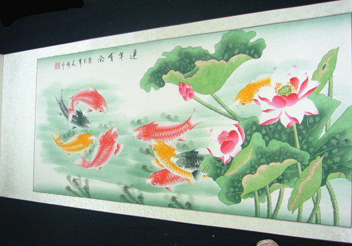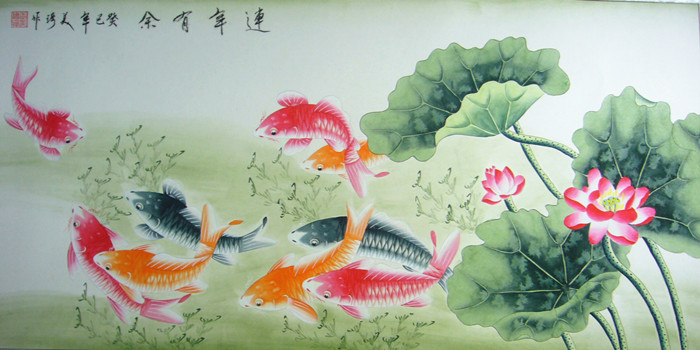 第一字画网的九鱼图连年有余,这幅四尺的九鱼作品裱完后尺寸近1.8米左右,是一幅非常清新的作品,作品画风细腻、栩栩如生,九鱼图寓意着长长久久,吉祥如意,挂在家里客厅或是送人都是非常不错的选择,如果放在画廊出售,王美琦老师此幅九鱼图作品的标价在1500元左右。“鱼”与“余”谐音,鱼则象征着富贵,所以中国吉祥图案中常有鱼的图案。九鱼图中,“九”取长长久久之意,“鱼”取其万事如意,寓意年年有余,富贵有余。
