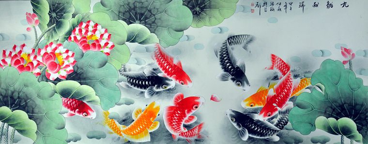 家中常见的四季风景画,牡丹,九鱼荷花图国画竹子寓意吉祥的花鸟画作品,显示春意盎然、充满朝气、富贵吉祥。