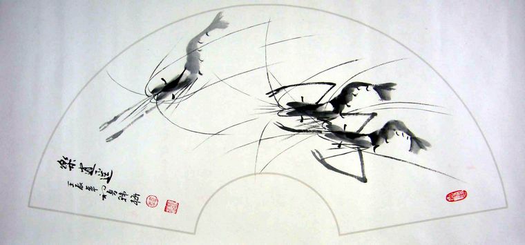 • 产品简介: 水墨虾,画家韩梅扇形小作品,已装裱。