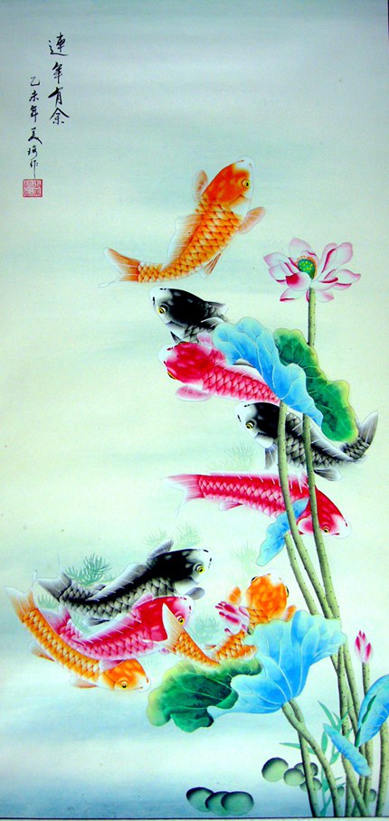 第一字画网的四尺竖幅九鱼图,已装裱成轴,可以直接悬挂。四尺竖幅九鱼图裱完后尺寸近1.8米左右,是一幅清新的作品,九鱼图寓意着长长久久,吉祥如意,挂在家里客厅或是餐厅是非常不错的选择,如果放在画廊出售,王美琦老师此幅连年有余工笔画的标价在1200元左右。“鱼”与“余”谐音,鱼则象征着富贵,所以中国吉祥图案中常有鱼的图案。九鱼图中,“九”取长长久久之意,“鱼”取其万事如意,寓意年年有余,富贵有余。