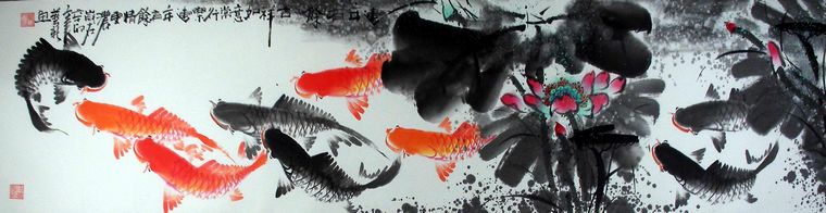 • 产品简介: 水墨九鱼图,汪艺新六尺对开作品,已装裱。
